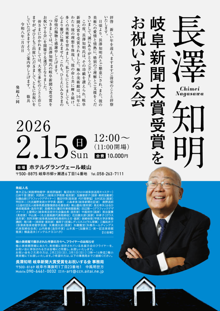 この度、長澤 知明氏は、その功績を讃えられ、岐阜新聞大賞を受賞されました。極小美術館は、16年にわたり彼の理想を体現し、彼の命と共に輝き続け、多くの美術家を育みました。私どもにとりましても、心より慶びに堪えません。これも、ひとえにみなさまのご厚情の賜物と感謝申し上げます。
