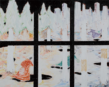 ところで、別所さんの最新作では、画面に窓の桟の十字形が現れたり、電柱や木の幹の縦線が描かれたりし、より画面が構成的になってきつつある。描き込むよりはむしろ画面全体のイメージを大切にしたいという意図が顕著になってきた。また、複数の場面を一つの画面に描く異時同図法のような描き方も試みている。そこには物語性があり、空間と時間の錯綜が生じる。新たな展開が予想されるのである。