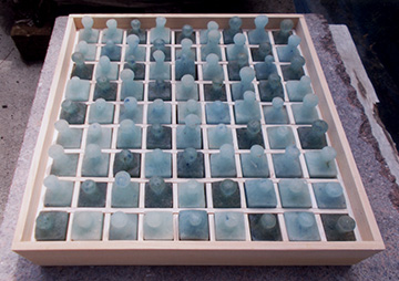 近年の水野氏の作品は、石の器の中に小さなオブジェ状の石を詰め込んだり、升目状に区切った木の箱の中に石やガラスの作品を並べるなど、入れ物の中に小さな造形物を入れたものが多い。それらには蓋が付いており、蓋を開けるとそこにひとつの世界が広がるような仕掛けとなっている。展示の際に蓋を開けておいた方が中身がわかるのだが、作家はどちらかというと蓋を閉めておいて、状況が許せば、観客に開ける楽しみを体験して欲しいと考えているそうだ。